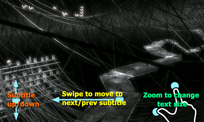d) SUBTITLE GESTURES - Scroll forward/backward to move to next/previous text, Up/down to move text up and down, Zoom in/out to change text size.